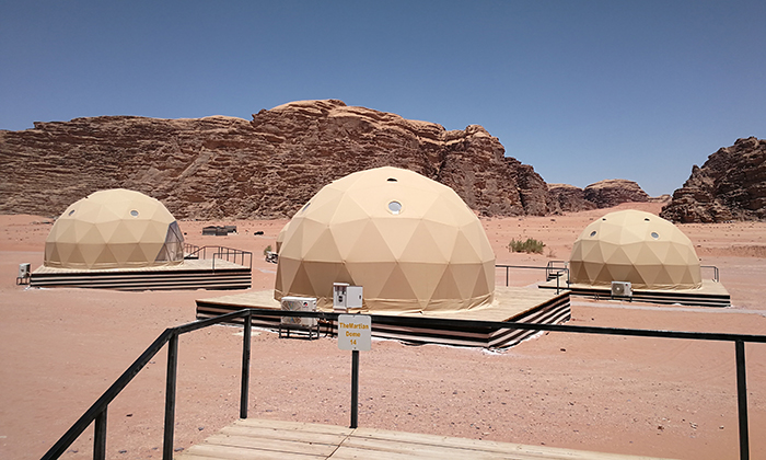 從設計外觀看球形帳篷。采用了三角形網架的設計架構搭配高強度的管材,塑造