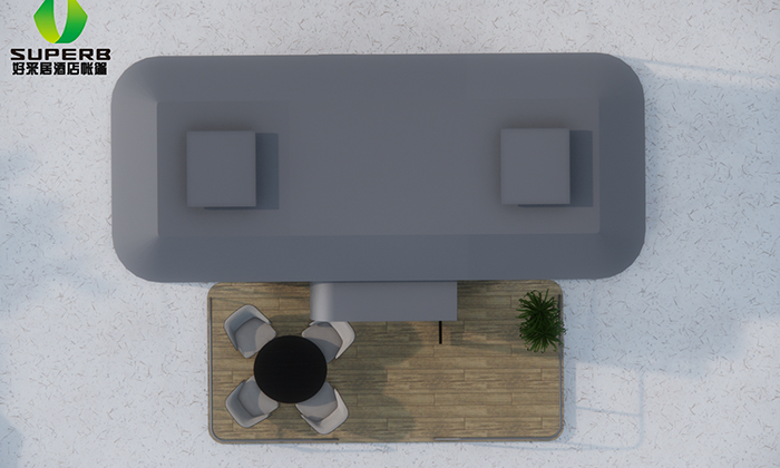 這款產品是天幕小屋家庭款,產品戶型是標準間,外部面積:72 ㎡,內部面積:38 ㎡,外部尺寸:8*9 m ,內部尺寸: 4.5*8.5m,主體高度:3.7 m ,墻面高度:2.2 m,防風等級:8 級。
