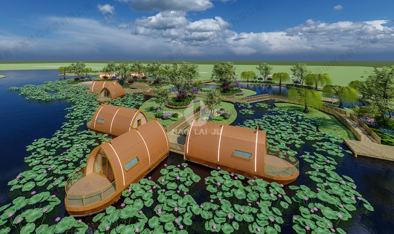 施工的過程也是最大限度的減少對環境的破壞,結構構件由工廠預制后再現場組裝,船屋主體由插入地下中的金屬管樁提供支撐。施工現場無濕作業無揚塵,清潔簡單高效,是保護生態環境的最佳建造方式。